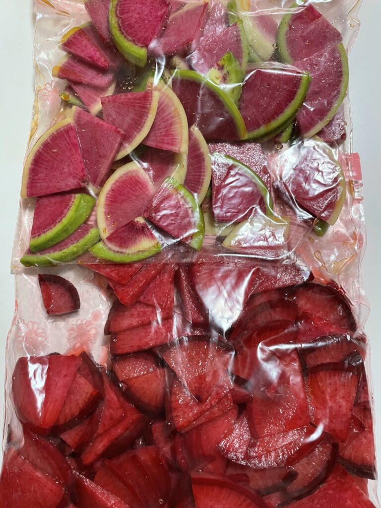 ①新鮮な大根を薄切り麺つゆか白だしで煮る