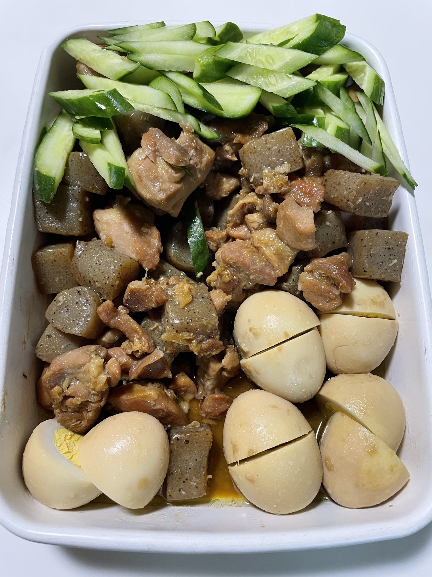 ②お酢.醤油.砂糖1:1:1でそこに水も肉がかぶるほど入れて煮る。煮えたら蒟蒻とゆで卵も入れてかさ増し!