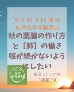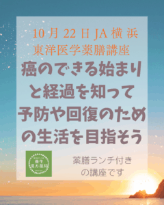 10月のJA横浜薬膳講座は、がんのお話を東洋医学的に解説します。すごく人気の講座です。 詳細はこちらから https://ja-cookingsalon.jp/mousikomi/index.php?ym=2025-10